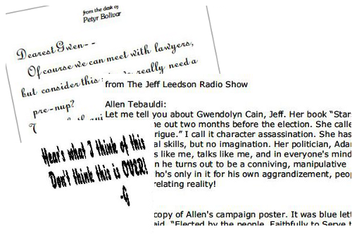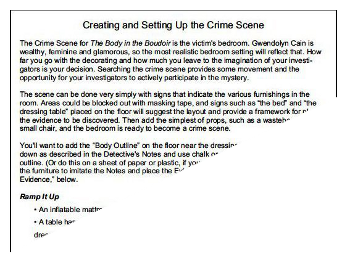This photo of the Crime Scene was taken at the premiere production of The Body in the Boudoir at the Mayfield Branch of Cuyahoga County Public Library on March 25, 2011. Props were loaned by various members of the Friends of the Library to create the scene in Gwendolyn Cain's bedroom. The large windows look out onto the garden court. Crime Scene tape, available for purchase at on-line locations, adds to the atmosphere, as does a "body outline" on the floor!