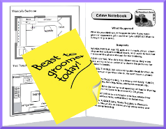it out on colored paper, but could also be recreated with colored paper and a bold marker. Behind it is pictured the Crime Notebook given to each Investigator.